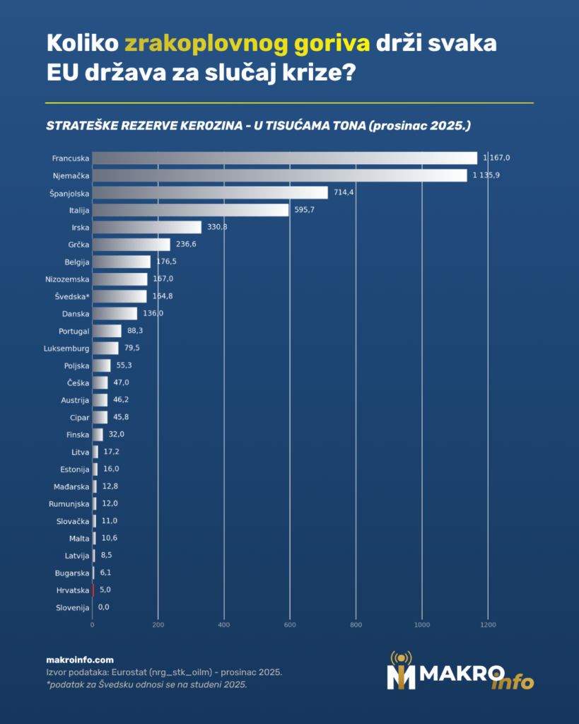 Hrvatska trenutno drži točno 5.000 tona strateških rezervi zrakoplovnog goriva (kerozina), što nas čini državom s najmanje zaliha u Europskoj uniji nakon susjedne Slovenije koja uopće ne drži zalihe kerozina. To je stanje zabilježeno u Eurostatovom mjesečnom izvještaju za prosinac 2025., posljednjem izvještaju koji bilježi stanje u svim članicama EU.